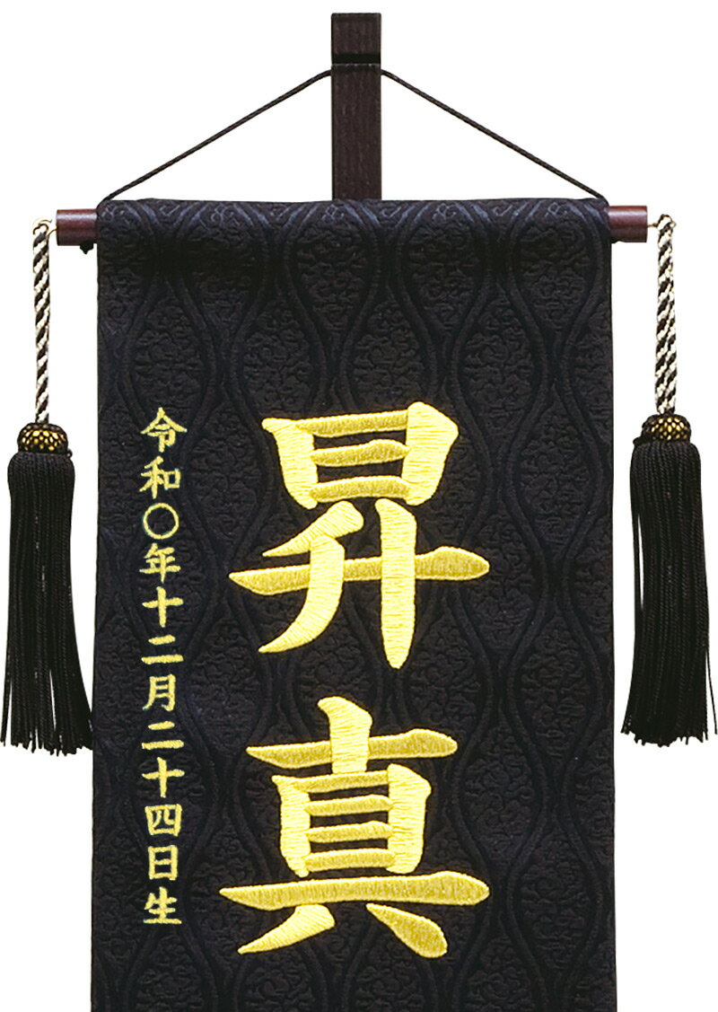 お子さまのお名前と生年月日を、豪華な金糸刺繍で書き順通りにお入れします。