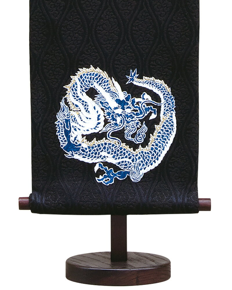 皇族やお公家など高貴な身分に親しまれた有職文様・雲立涌の地紋を織り込んだ名物裂の生地に、立身出世の象徴である龍をあしらった名前旗です。