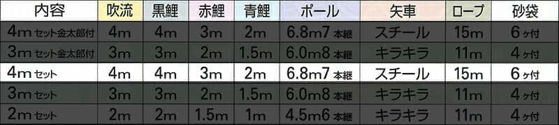セットの鯉の中で、一番長い「黒鯉」の全長で選びます。本格的な大きい鯉のぼりもご用意しています。よく選ばれているのは4m、3mセットです。