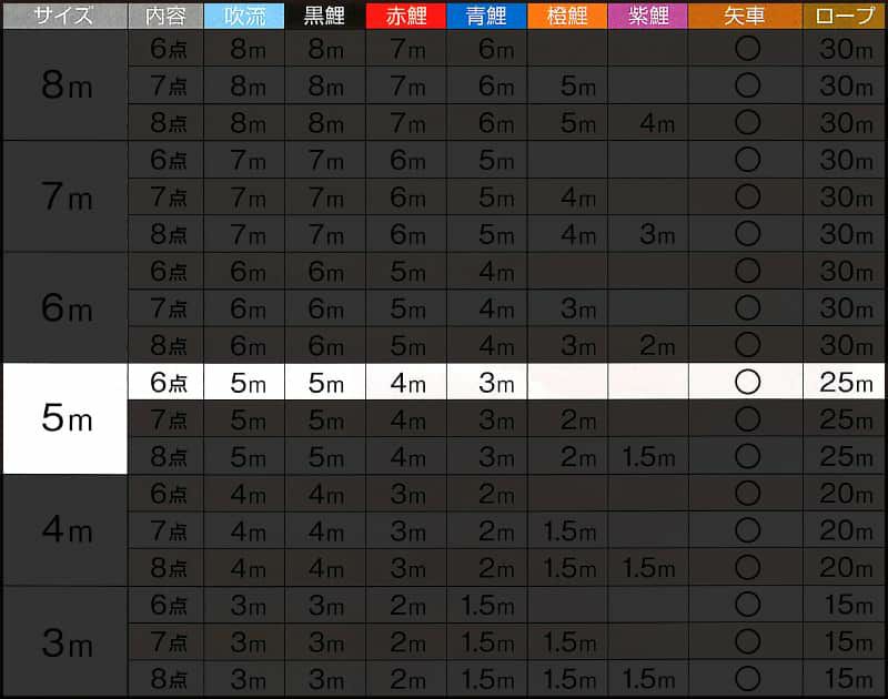 セットの鯉の中で、一番長い「黒鯉」の全長で選びます。本格的な大きい鯉のぼりもご用意しています。よく選ばれているのは4m、3mセットです。
