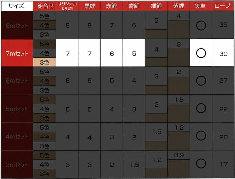セットの鯉の中で、一番長い「黒鯉」の全長で選びます。本格的な大きい鯉のぼりもご用意しています。よく選ばれているのは4m、3mセットです。
