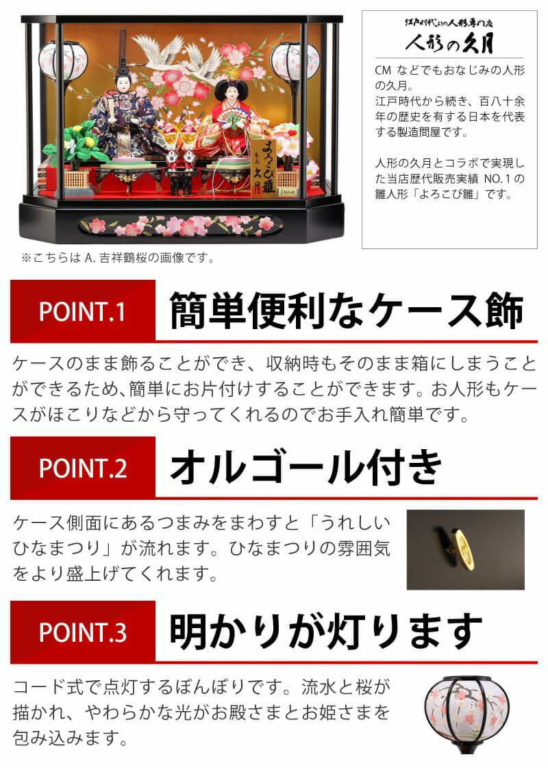 他の画像を見る 【送料無料】最安値に挑戦!2026年度新作 雛人形 雛人形 久月 ひな人形 雛 ケース飾り 親王飾り よろこび雛 六角ケース オルゴール付 【2026年度新作】【選べる2種類】 h243-k-4-37-9ab ¥ 64,801 税込 在庫切れ カートに入れる お気に入りに登録する