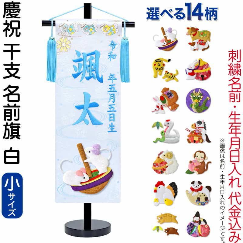 他の画像を見る 【送料無料】最安値に挑戦!2026年度新作 五月人形 五月人形 名前旗 男の子 慶祝 干支 白(小)刺繍 生年月日 名前入れ代金込み 金襴 縮緬 黒塗スタンド付 【選べる14種類】 5ad-eto-s-w ¥ 14,990 税込 カートに入れる お気に入りに登録する